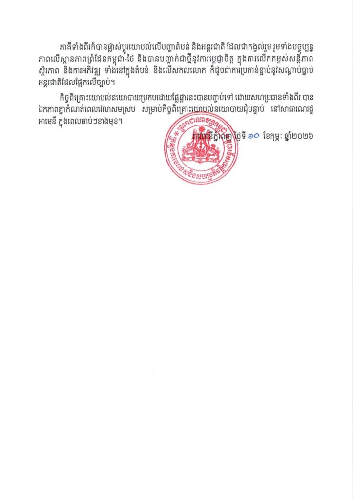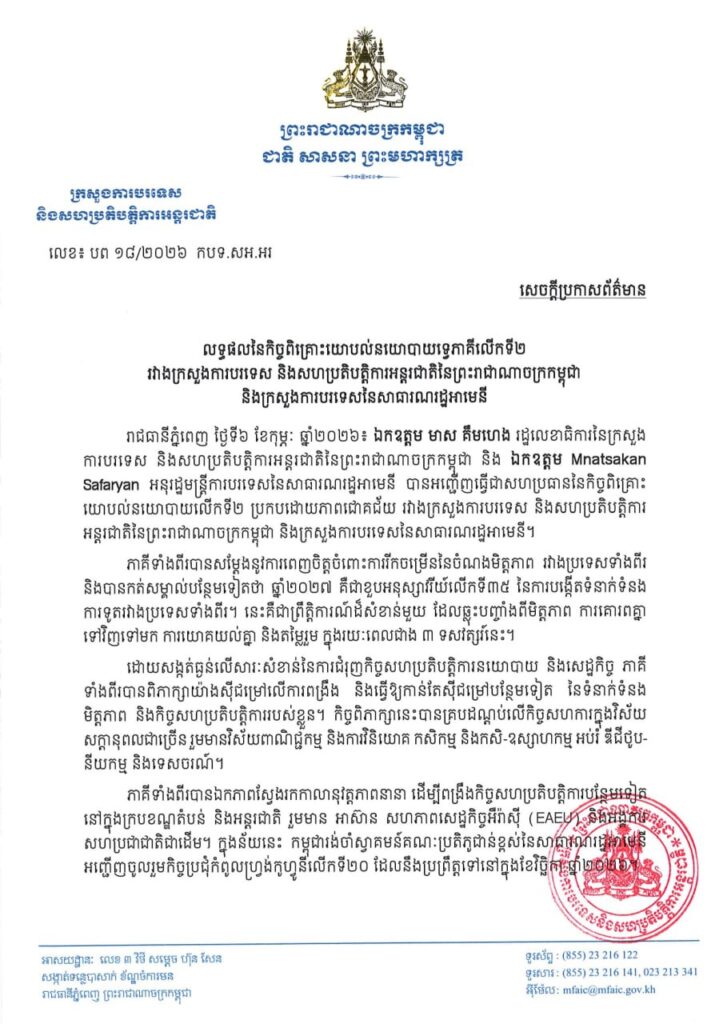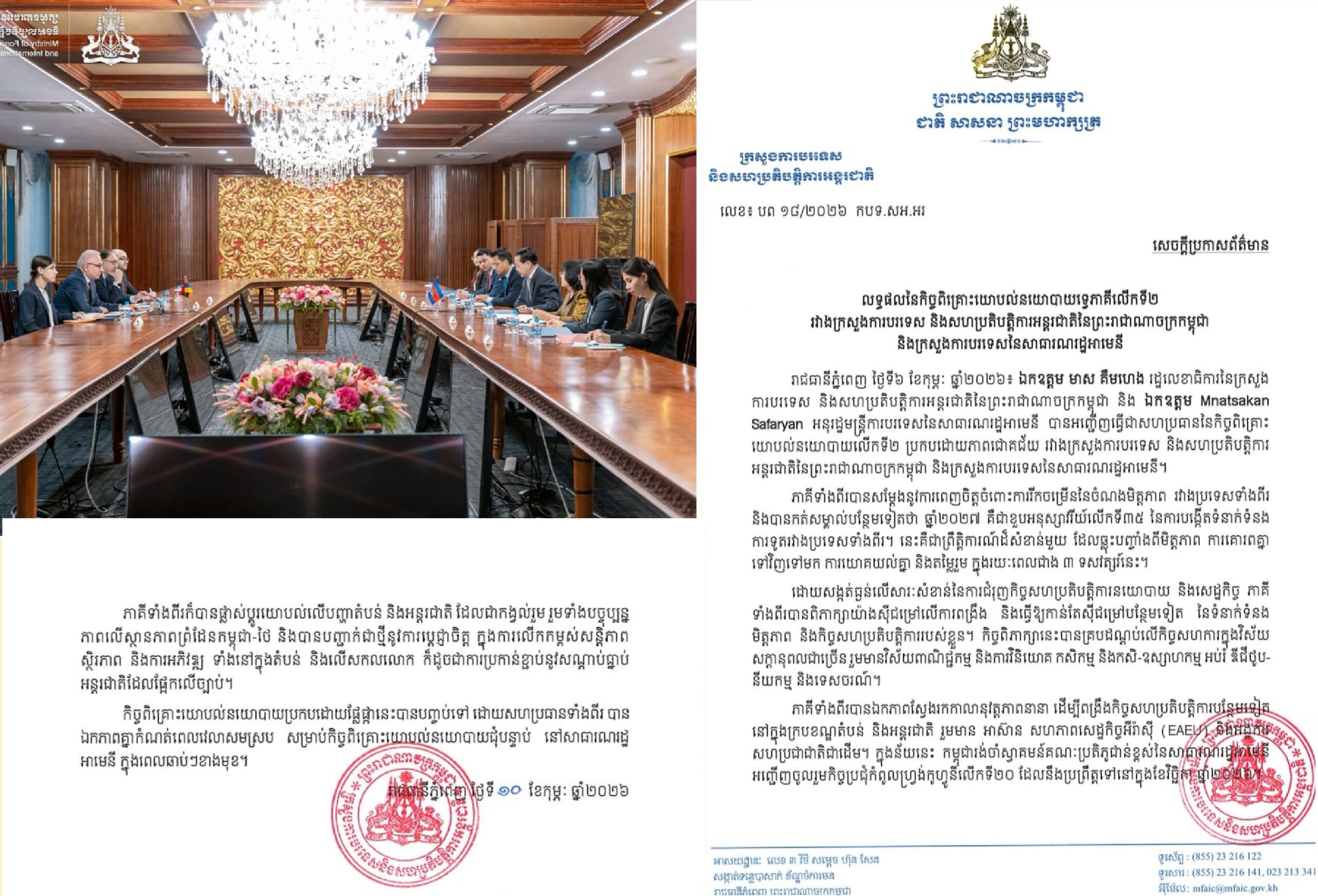 (ភ្នំពេញ)៖ បើតាមសេចក្តីប្រកាសព័ត៌មានរបស់ ក្រសួងការបរទេស និងសហប្រតិបត្តិការអន្តរជាតិកម្ពុជា ចេញផ្សាយនៅថ្ងៃទី១១ ខែកុម្ភៈ ឆ្នាំ២០២៦ បានឱ្យដឹងថា កម្ពុជា និងអាមេនី បន្តពង្រឹងកិច្ចសហប្រតិបត្តិការលើគ្រប់វិស័យ ដើម្បីលើកកម្ពស់មិត្តភាព និងការយោគយល់គ្នាទៅវិញទៅមក។ គួររំលឹកថា កាលពីថ្ងៃទី៦ ខែកុម្ភៈ ឆ្នាំ២០២៦ មាស គឹមហេង រដ្ឋលេខាធិការនៃក្រសួងការបរទេស និងសហប្រតិបត្តិការអន្តរជាតិនៃព្រះរាជាណាចក្រកម្ពុជា និង Mnatsakan Safaryan អនុរដ្ឋមន្ត្រីការបរទេសនៃសាធារណរដ្ឋអាមេនី បានអញ្ជើញធ្វើជាសហប្រធាននៃកិច្ចពិគ្រោះយោបល់នយោបាយលើកទី២ រវាងក្រសួងការបរទេសនៃប្រទេសទាំងពីរ ដែលប្រព្រឹត្តទៅប្រកបដោយភាពជោគជ័យ។ តាមសេចក្តីប្រកាសព័ត៌មានស្តីពីលទ្ធផលកិច្ចពិគ្រោះយោបល់នេះ ភាគីទាំងពីរ បានសម្តែងការពេញចិត្តចំពោះការរីកចម្រើននៃចំណងមិត្តភាពរវាងប្រទេសទាំងពីរ និងបានកត់សម្គាល់ថា ឆ្នាំ២០២៧ នឹងជាខួបអនុស្សាវរីយ៍លើកទី៣៥ នៃការបង្កើតទំនាក់ទំនងការទូតកម្ពុជា–អាមេនី ដែលឆ្លុះបញ្ចាំងពីមិត្តភាព ការគោរពគ្នាទៅវិញទៅមក ការយោគយល់ និងតម្លៃរួម ក្នុងរយៈពេលជាង ៣ ទសវត្សរ៍។ ដោយសង្កត់ធ្ងន់លើសារៈសំខាន់នៃការជំរុញកិច្ចសហប្រតិបត្តិការនយោបាយ និងសេដ្ឋកិច្ច ភាគីទាំងពីរ បានពិភាក្សាយ៉ាងស៊ីជម្រៅអំពីការពង្រឹងទំនាក់ទំនងមិត្តភាព និងកិច្ចសហប្រតិបត្តិការទ្វេភាគី ក្នុងវិស័យសក្តានុពលជាច្រើន រួមមាន ពាណិជ្ជកម្ម និងការវិនិយោគ កសិកម្ម និងកសិ-ឧស្សាហកម្ម អប់រំ ឌីជីថលនីយកម្ម និងទេសចរណ៍។ ភាគីទាំងពីរ ក៏បានឯកភាពស្វែងរកកាលានុវត្តភាពនានា ដើម្បីពង្រឹងកិច្ចសហប្រតិបត្តិការបន្ថែមទៀត នៅក្នុងក្របខណ្ឌតំបន់ និងអន្តរជាតិ រួមមាន អាស៊ាន, សហភាពសេដ្ឋកិច្ចអីរ៉ាស៊ី (EAEU) និង អង្គការសហប្រជាជាតិ។ ក្នុងន័យនេះ កម្ពុជា បានបញ្ជាក់ការរង់ចាំស្វាគមន៍គណៈប្រតិភូជាន់ខ្ពស់នៃសាធារណរដ្ឋអាមេនី អញ្ជើញចូលរួមកិច្ចប្រជុំកំពូលហ្វ្រង់កូហ្វូនី លើកទី២០ ដែលនឹងប្រព្រឹត្តទៅនៅខែវិច្ឆិកា ឆ្នាំ២០២៦។ ជាមួយគ្នានេះ ភាគីទាំងពីរ ក៏បានផ្លាស់ប្តូរយោបល់លើបញ្ហាតំបន់ និងអន្តរជាតិដែលជាកង្វល់រួម រួមទាំងស្ថានភាពព្រំដែនកម្ពុជា–ថៃ និងបានបញ្ជាក់ជាថ្មីនូវការប្តេជ្ញាចិត្ត ក្នុងការលើកកម្ពស់សន្តិភាព ស្ថិរភាព និងការអភិវឌ្ឍ ទាំងក្នុងតំបន់ និងលើសកលលោក ព្រមទាំងការគោរពសណ្តាប់ធ្នាប់អន្តរជាតិ ដែលផ្អែកលើច្បាប់។ កិច្ចពិគ្រោះយោបល់នយោបាយប្រកបដោយផ្លែផ្កានេះ បានបញ្ចប់ដោយសហប្រធានទាំងពីរ ឯកភាពគ្នាកំណត់ពេលវេលាសមស្រប សម្រាប់កិច្ចពិគ្រោះយោបល់នយោបាយជុំបន្ទាប់ នៅសាធារណរដ្ឋអាមេនី ក្នុងពេលឆាប់ៗខាងមុខ៕